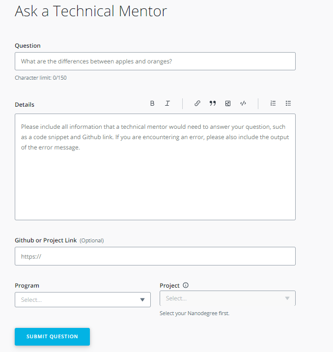 Provide Details and Links: explaining what (if anything) you’ve already attempted to solve the problem helps mentors know where to start when answering your question. Likewise, if your question is not related specifically to a project, but rather to an exercise, quiz, or lesson, it’s helpful to include information such as lesson or quiz name, screenshots, and classroom links.