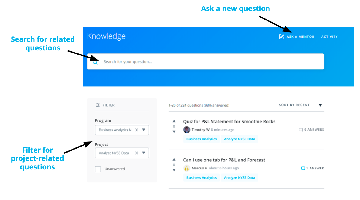 When you ask a new question, the platform immediately assigns it to one of our expert mentors spread across the globe to ensure prompt replies. Of note, when a mentor answers your question, you will see “Mentor” next to their name to differentiate their support from comments your fellow learners may also provide.