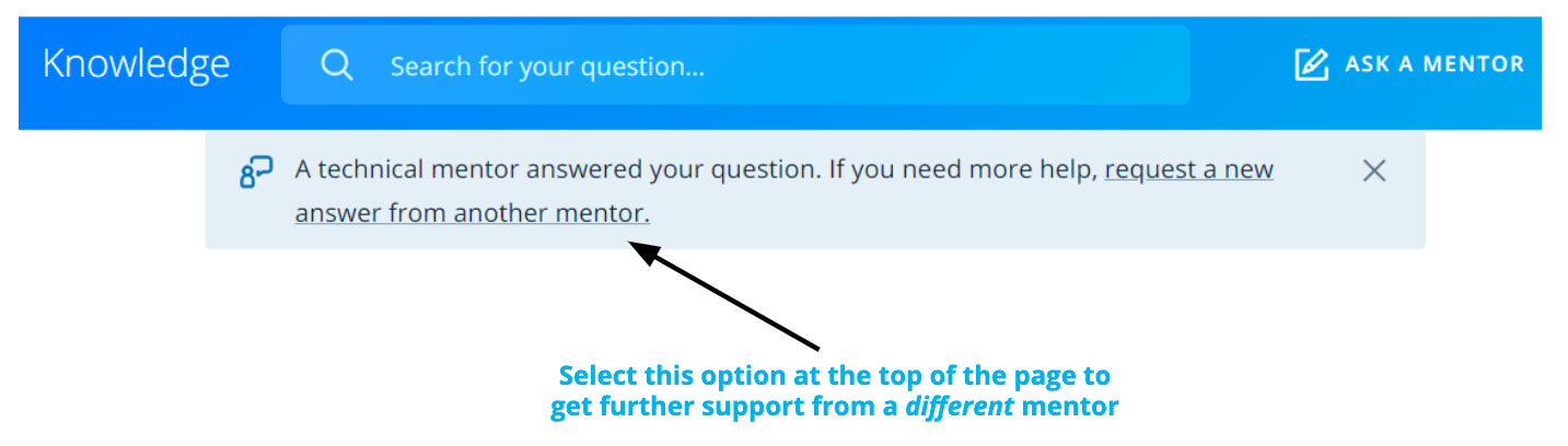 If you receive an answer that you are not satisfied with and want a different mentor to chime in, kindly select the option at the top of the page in Knowledge. If you reply directly in the comments section, without clicking on the link at the top of the page, your question will not be answered by another mentor.